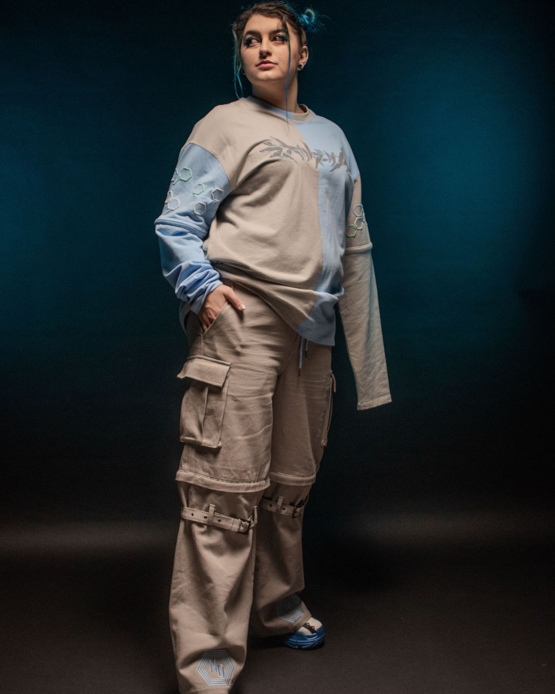 • Shirt: Zipper-detachable sleeves, reflective front print with embroidered overlay + puff hexagon sleeve prints