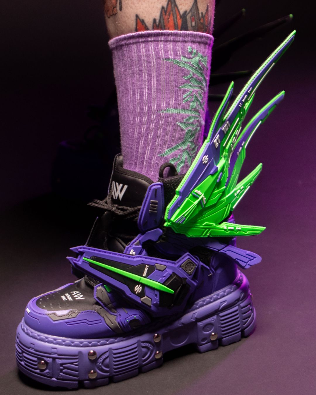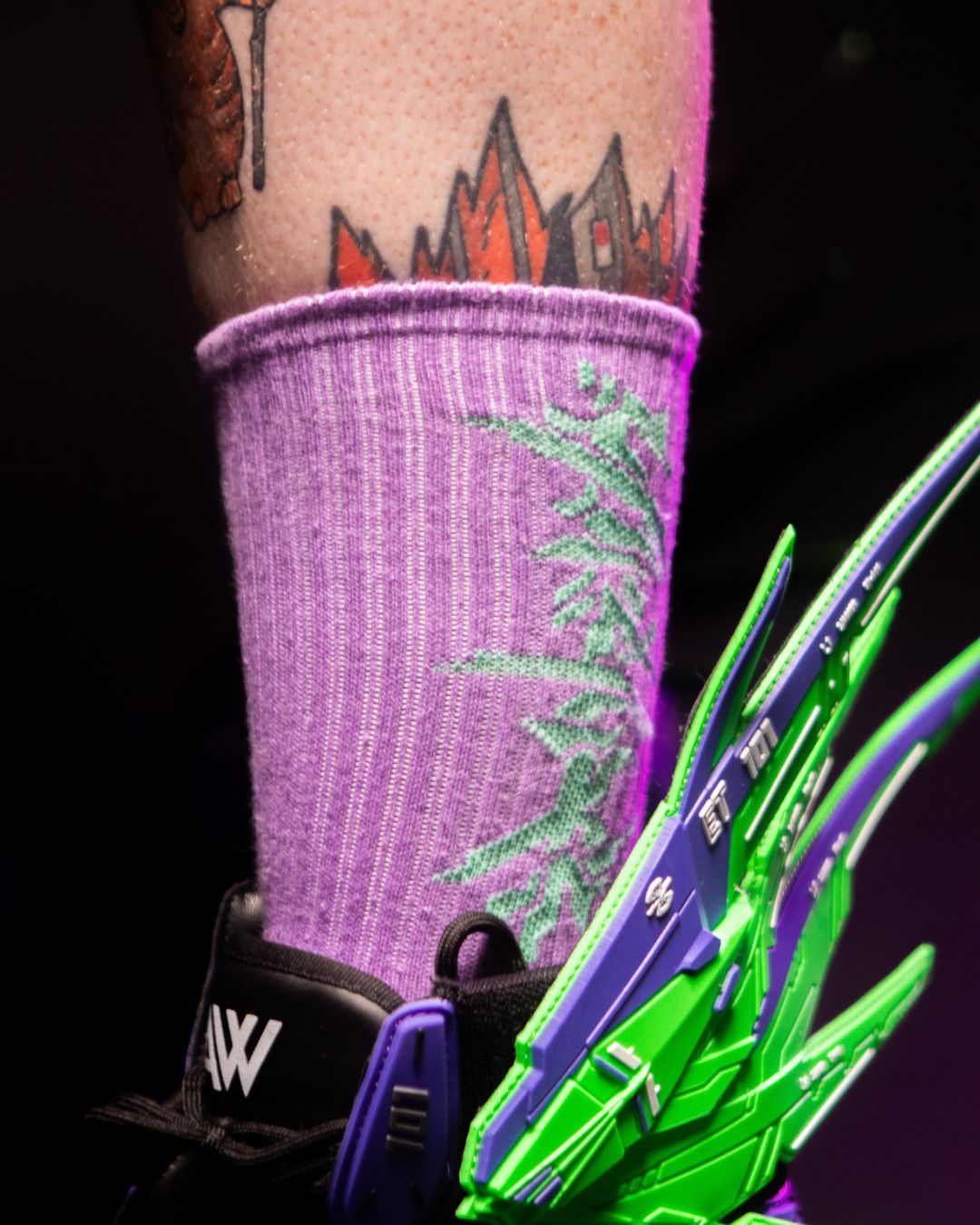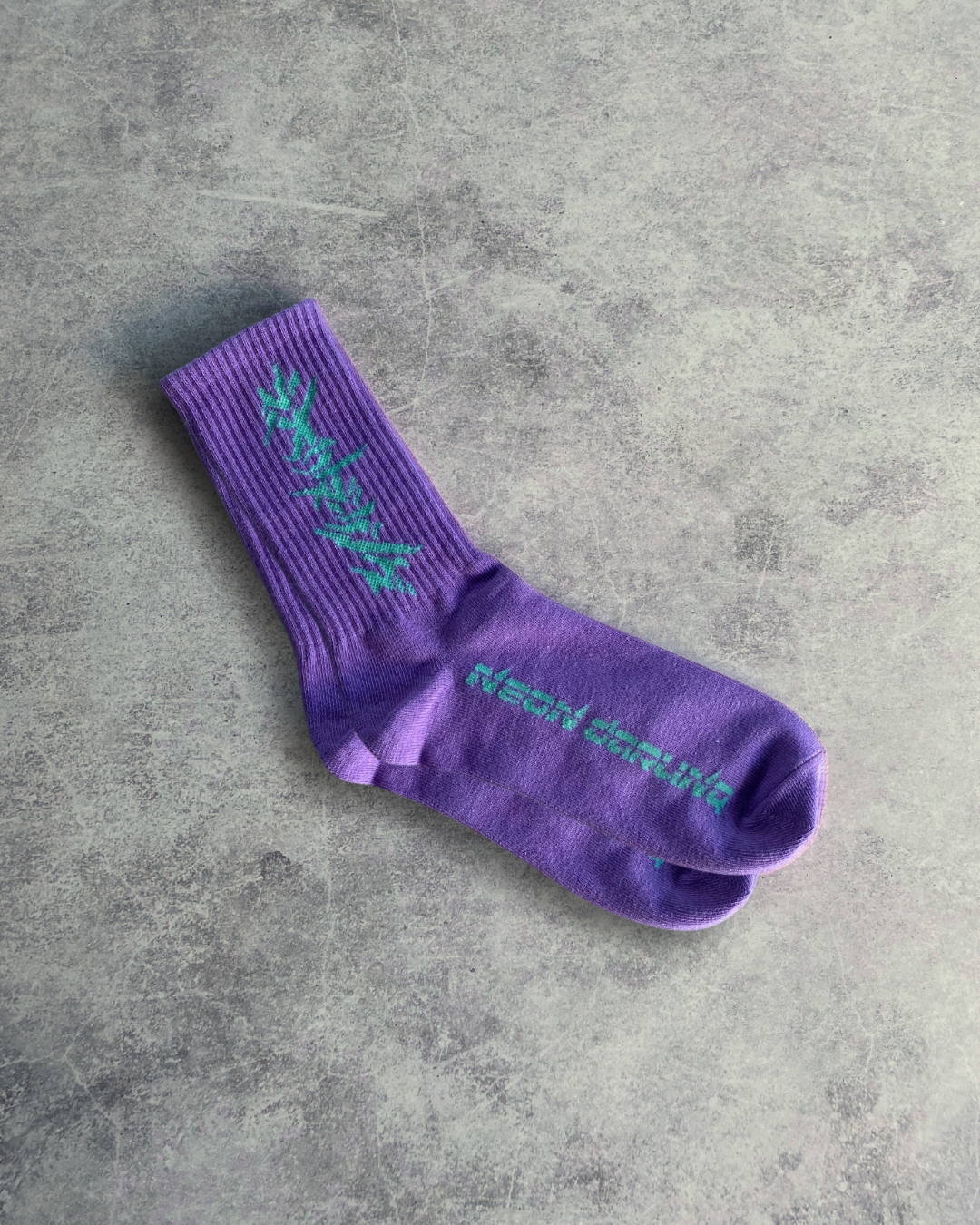 DETAILING: Neon pastel purple base with jacquard-woven green logos.
