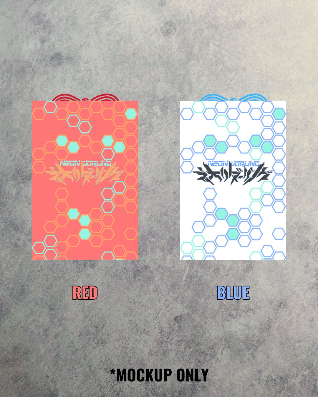 Scattered hexagon design, kanji front + Neon Darling cyber logo back.